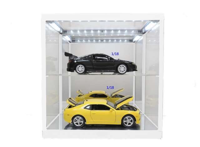 Vitrina Alba cu iluminare LED pentru machete cu oglinda in partea de jos si peretele din spate scala 1/18, 1/24, 1/43, 1/64